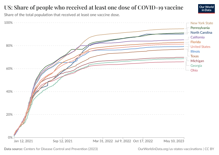 Centers for Disease Control and Prevention (2023) – processed by Our World in Data. “US: Share of people who received at least one dose of COVID-19 vaccine” [dataset]. Centers for Disease Control and Prevention, “COVID-19, Vaccinations (United States)” [original data]. Retrieved February 25, 2026 from https://style-housekeeper-simplifyre.owid.pages.dev:8789/20250909-093708/grapher/us-covid-19-share-people-vaccinated.html (archived on September 9, 2025).