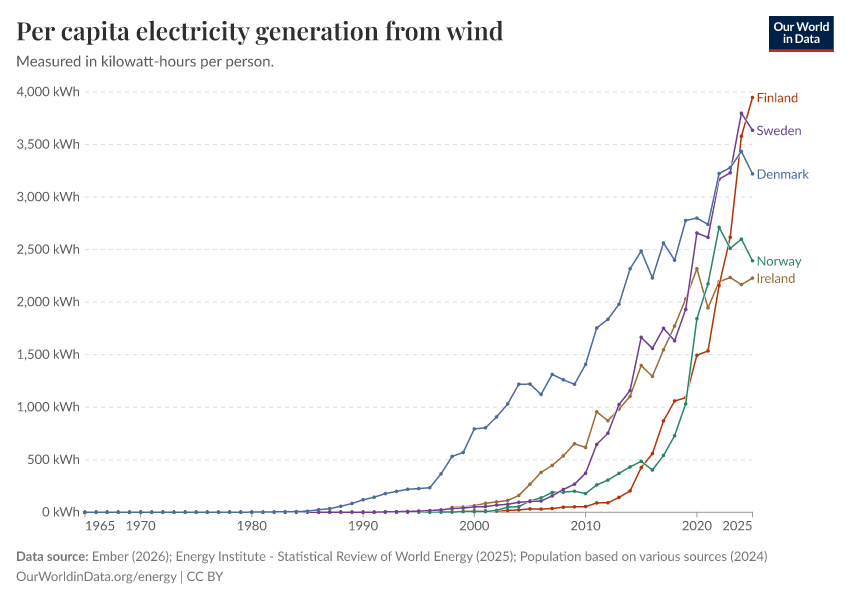 “Data Page: Electricity generation from wind power per person”, part of the following publication: Hannah Ritchie, Pablo Rosado, and Max Roser (2023) - “Energy”. Data adapted from Ember, Energy Institute, Various sources. Retrieved from https://style-housekeeper-simplifyre.owid.pages.dev:8789/20260203-171503/grapher/wind-electricity-per-capita.html [online resource] (archived on February 3, 2026).How to cite this data