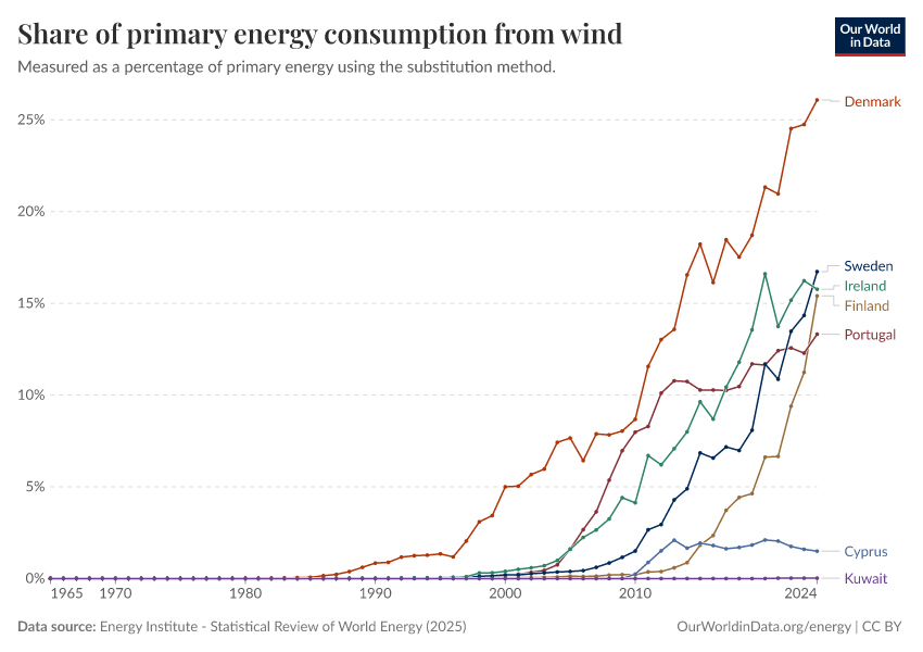 Energy Institute - Statistical Review of World Energy (2025) – with major processing by Our World in Data. “Share of primary energy consumption that comes from wind power – Using the substitution method” [dataset]. Energy Institute, “Statistical Review of World Energy” [original data]. Retrieved February 25, 2026 from https://style-housekeeper-simplifyre.owid.pages.dev:8789/20260119-070102/grapher/wind-share-energy.html (archived on January 19, 2026).
