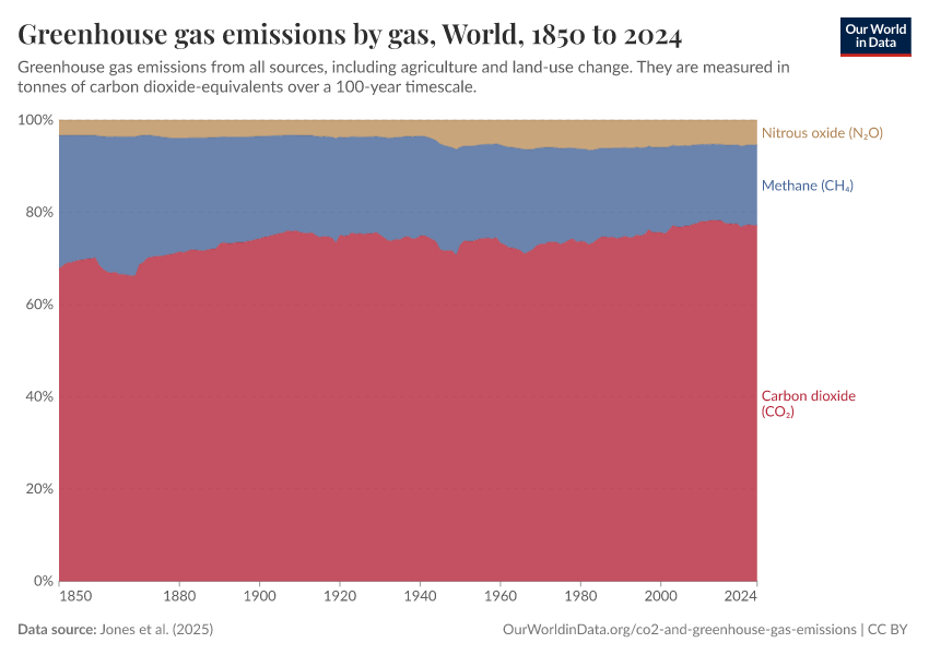 Here we look at total greenhouse gas (GHG) emissions across the world, plus breakdowns of other major gases including methane and nitrous oxide.