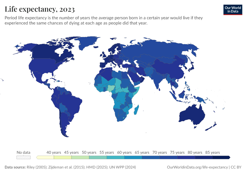 To understand the health of a population, one useful approach is to look at life expectancy. This is formally called the “period life expectancy at birth”, and is an indicator that summarizes death rates across all age groups in one particular year.