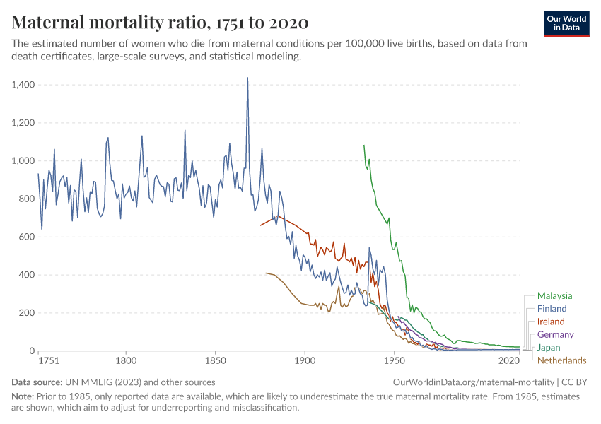 For example, Finland began reducing its maternal mortality rates in the mid-19th century, but it took over a century to achieve today's low levels. Malaysia, on the other hand, saw similar improvements within just a few decades, which occurred much later.