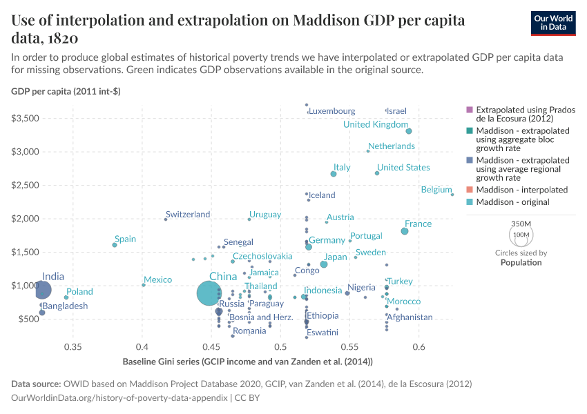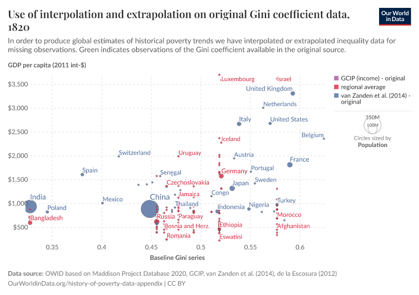 - For the purposes of replication, the fully interpolated dataset is shown in the two charts below. Both charts show the same data points: GDP per capita along the horizontal axis, Gini coefficient along the vertical axis and population as bubble size. The colour indicates the source and treatment used to arrive at the GDP per capita data points and the Gini data points respectively.