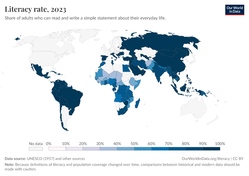 In many countries, more than 95% have basic literacy skills. Literacy skills of the majority of the population are a modern achievement as we show below.