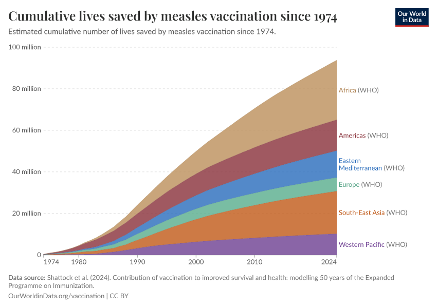 The impact has been greatest in Africa, with 29 million lives saved, and Southeast Asia, with 20 million lives saved. These are regions where measles was a leading cause of death in children until recently.