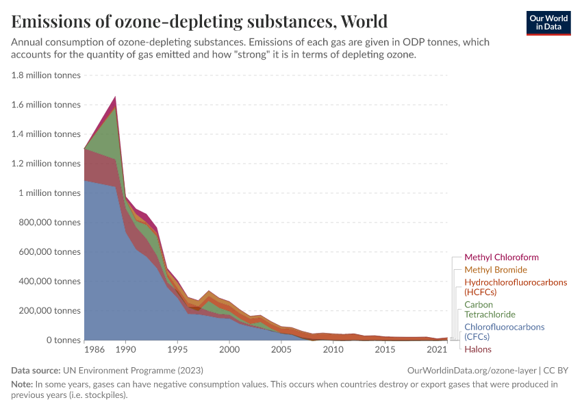During the 1980s, the world came together to form an international agreement to reduce – and eventually eliminate – emissions of these depleting substances. The political agreements were very effective. Since then, global emissions have fallen by more than 99%.