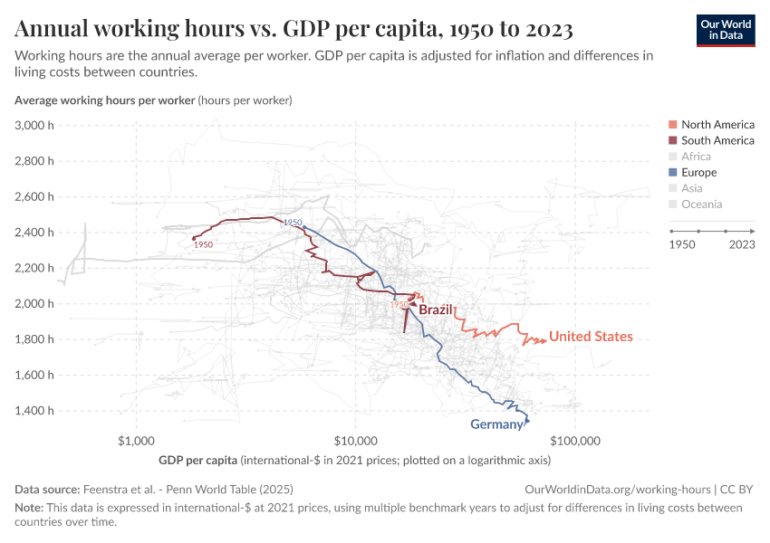 The four highlighted countries exemplify how working hours have decreased at the same time that average incomes have increased. Germany, for example, moved far to the right as its GDP per capita increased more than 10-fold, and far to the bottom as working hours nearly halved.3