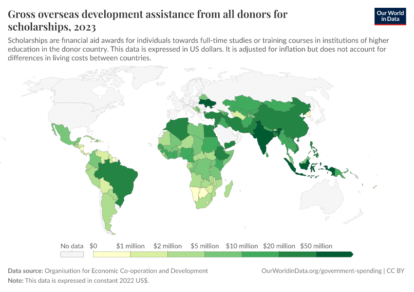 This indicator is disbursements of official development assistance (ODA) for scholarships, defined as financial aid awards for individual students and contributions to trainees, where students and trainees are nationals of recipient countries.