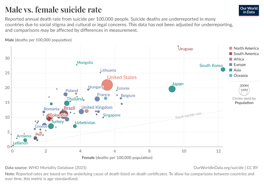On this page, we show data on the prevalence of suicide across the world, its risk factors, and how these trends are changing over time.