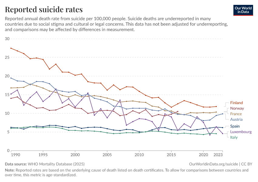 Saloni Dattani, Lucas Rodés-Guirao, Hannah Ritchie, Max Roser, and Esteban Ortiz-Ospina (2023) - “Suicides” Published online at OurWorldinData.org. Retrieved from: 'https://style-housekeeper-simplifyre.owid.pages.dev/suicide' [Online Resource]BibTeX citation
