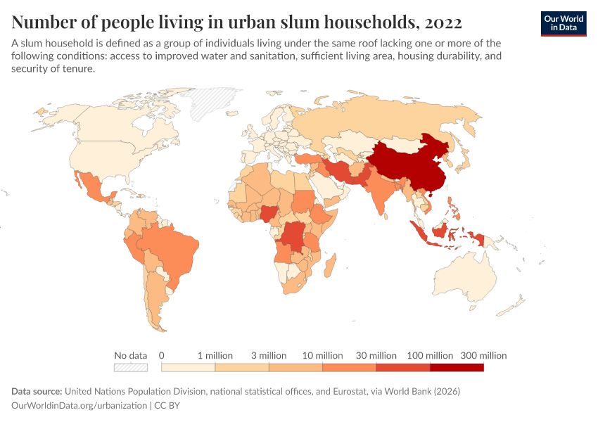 This map shows the total number of people living in urban slum households in each country.