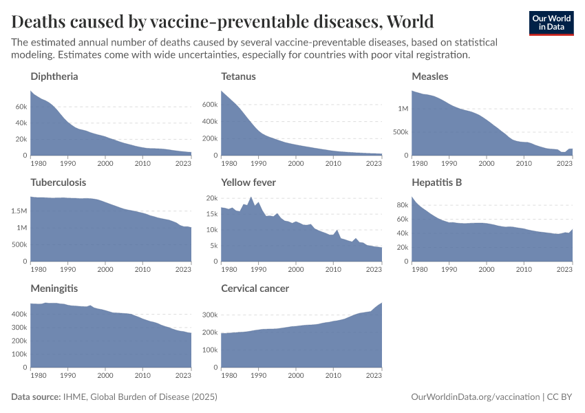In contrast, the decline in deaths from diseases like hepatitis B and cervical cancer has been more gradual. This is because these diseases typically cause illness and death much later in life, often decades after infection. As a result, the benefits of vaccination take longer to become visible in mortality trends, especially when it was introduced in recent decades.
