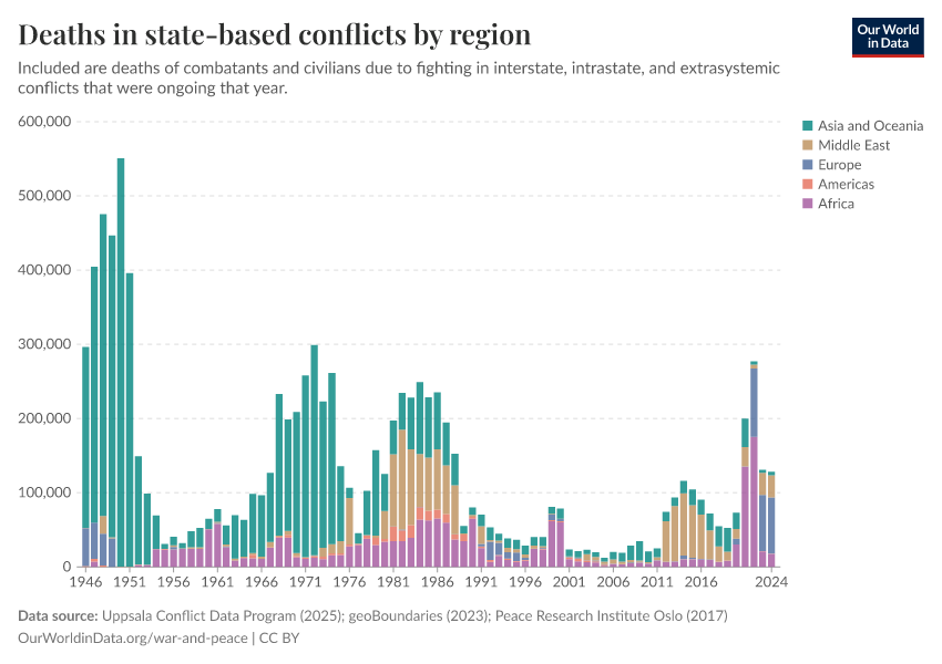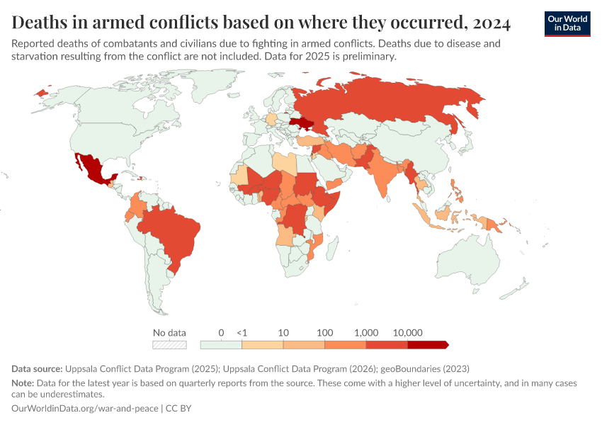 Bastian Herre, Lucas Rodés-Guirao, and Max Roser (2024) - “War and Peace” Published online at OurWorldinData.org. Retrieved from: 'https://style-housekeeper-simplifyre.owid.pages.dev/war-and-peace' [Online Resource]BibTeX citation