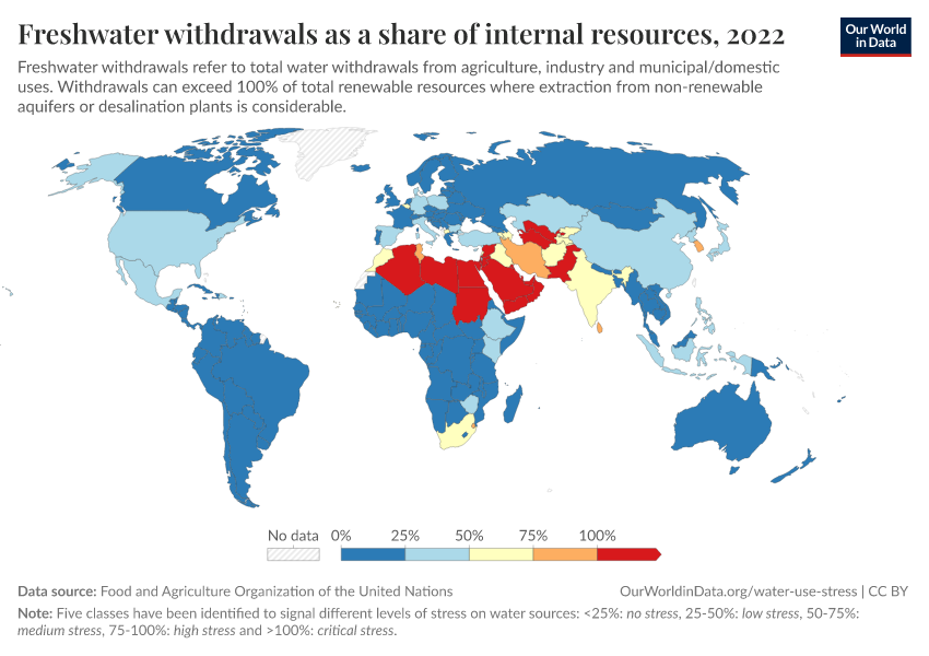 The visualization provides a measure of levels of water stress across the world. This is measured based on freshwater withdrawals as a share of internal (renewable) resources. The Food and Agriculture Organization of the United Nations categorizes water stress in the following ways: if withdrawals are less than 25 percent of resources, then a country has no water stress; 25-50 percent is low stress; 50-75 percent is medium; 75-100 percent high stress; and greater than 100 percent is critical stress.3